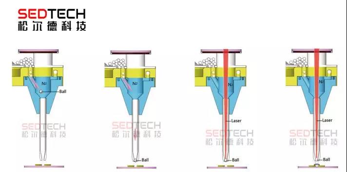 一种全新的锡焊贴装工艺,能将容器中的锡球通过特制的单锡珠分球系统转移至喷射头,通过激光的高脉冲能量,瞬间熔化置于喷射头上的锡球,再利用惰性气体压力将熔化后的锡料,喷射到焊点表面,形成互联焊点。锡量恒定,分球焊接速度特别快,精度高,是表面贴装类工艺的全新焊接解决方案,可应用于各大行业,适用面广。